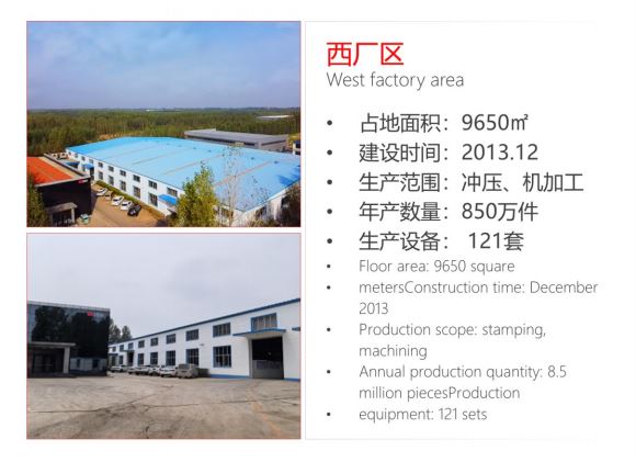 公司占地16730平方米,拥有固定资产3950万元,集产品研发、模具制造、市场销售于一体,主要生产各种金属冲压制品,产品涉及汽车配件、电子配件、机箱机柜、医疗器械、家居五金等领域。公司生产设备先进,技术力量雄厚,拥有自己的产品研发中心;拥有杨力400T冲床,200T拉伸机,315T拉伸机,数控冲床等大型冲压设备数十台;拥有现代化数控车床,折弯机,剪板机,激光雕刻机、电焊机、热处理、喷涂流水线等先进设备。