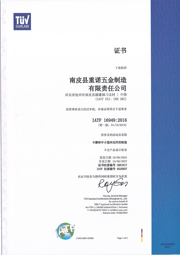 公司获得IATF 16949:2016管理体系认证