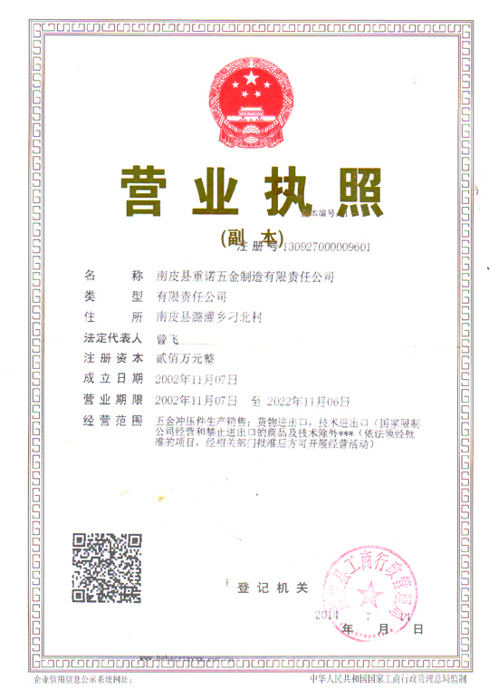 南皮县重诺五金制造有限责任公司,成立于2002年。是一家专业从事金属制品设计生产的私营企业,地处河北省南皮县境内,紧临京沪高速公路、京沪高铁交通便利,环境优越。